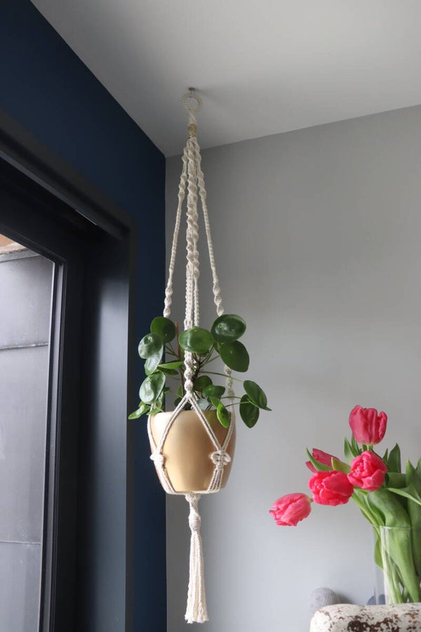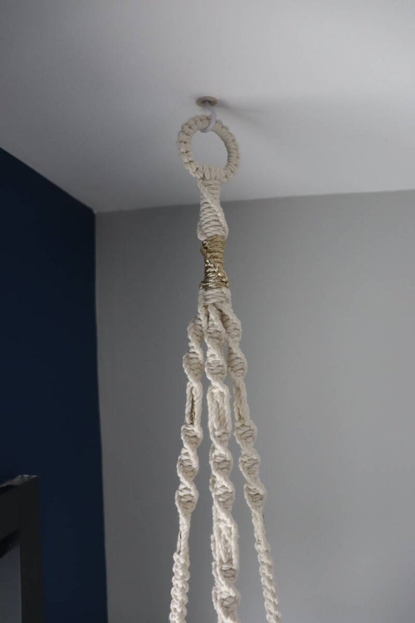 Suspension pour plante en macramé confectionnée en 100% coton bio certifié GOTS avec une corde tressée 3 plis 3mm coloris écru avec insertion de corde dorée