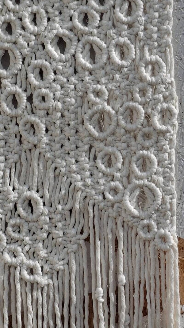 Cette création artisanale en macramé, toute en coton peigné écru très doux, joue avec une série d’anneaux noués. Des cercles sans fin qui nous entraînent de gauche à droite et de droite à gauche, comme une parenthèse hors du temps.