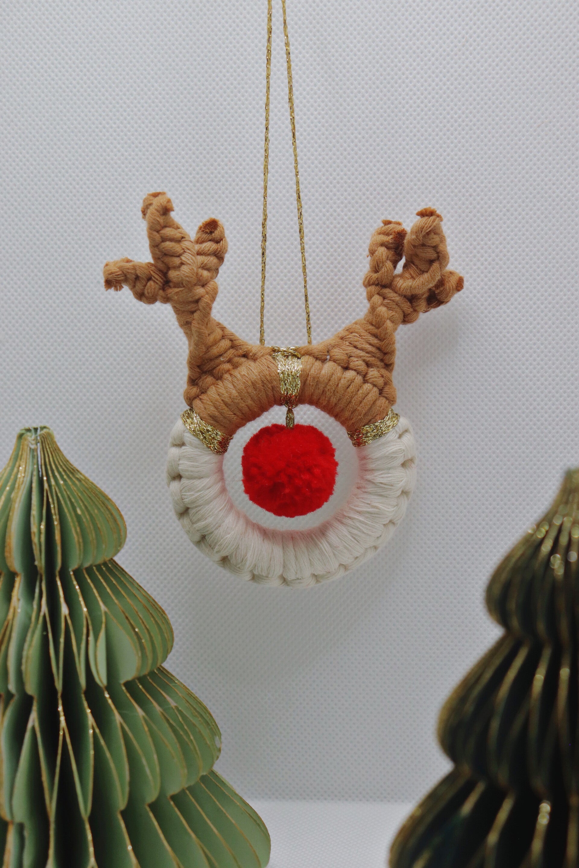 Apportez une touche originale et bohème à vos fêtes avec ce petit renne en macramé, décoré d’un pompon rouge en guise de nez.