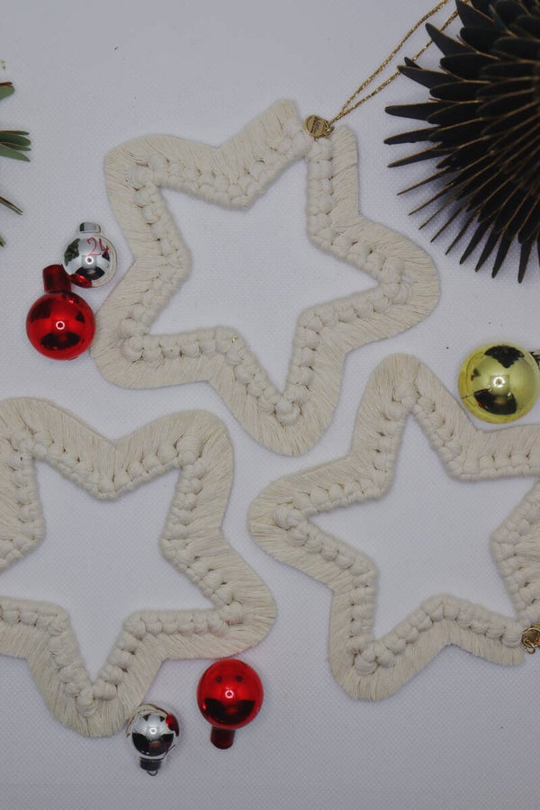 Ces grandes étoiles écrues en macramé apportent une touche bohème et élégante à votre sapin ou votre décoration de fête.