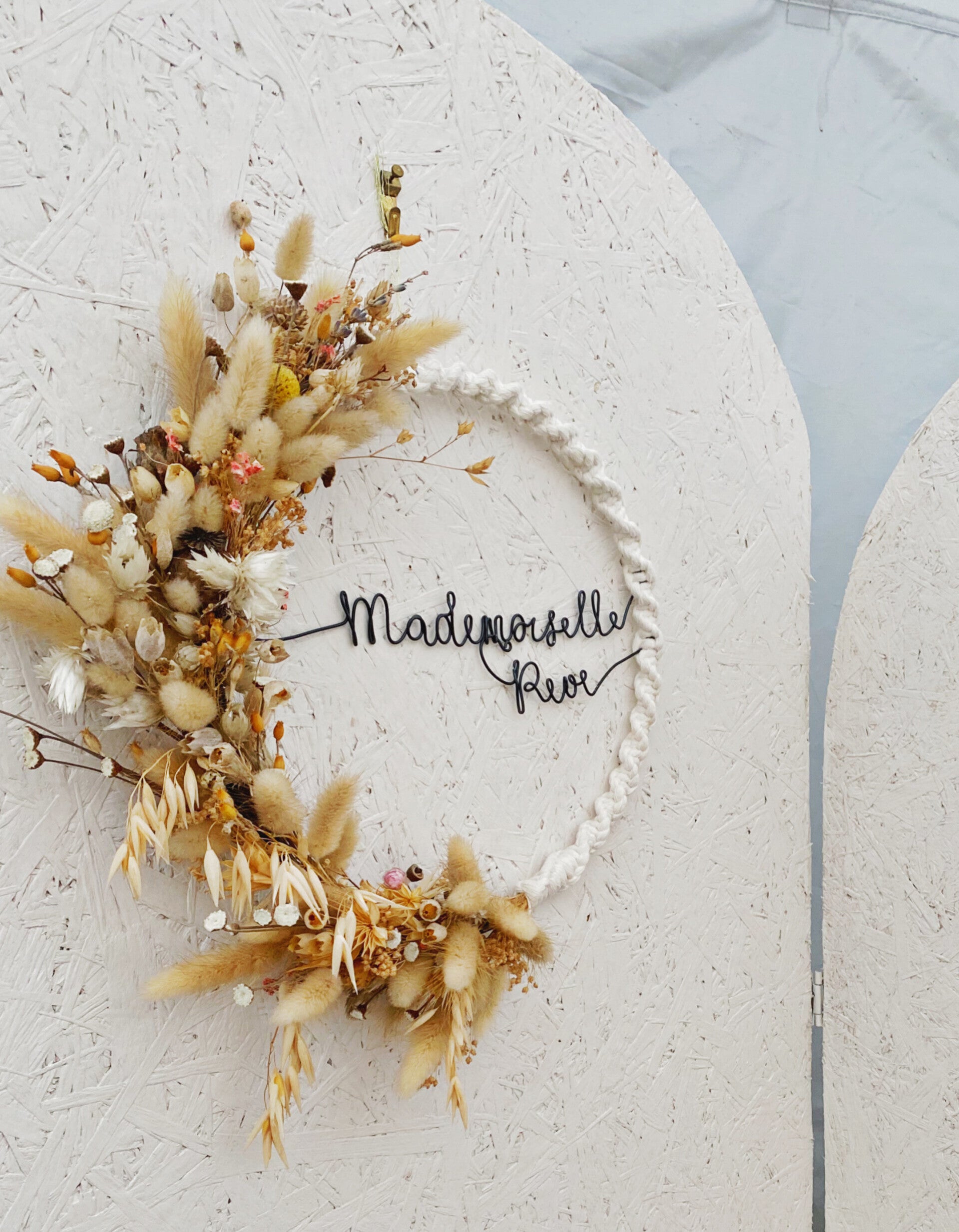Couronne "Mademoiselle Rêve"_ 🌸 Couronne de fleurs séchées en macramé écru – Suspension murale