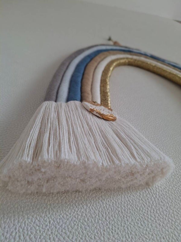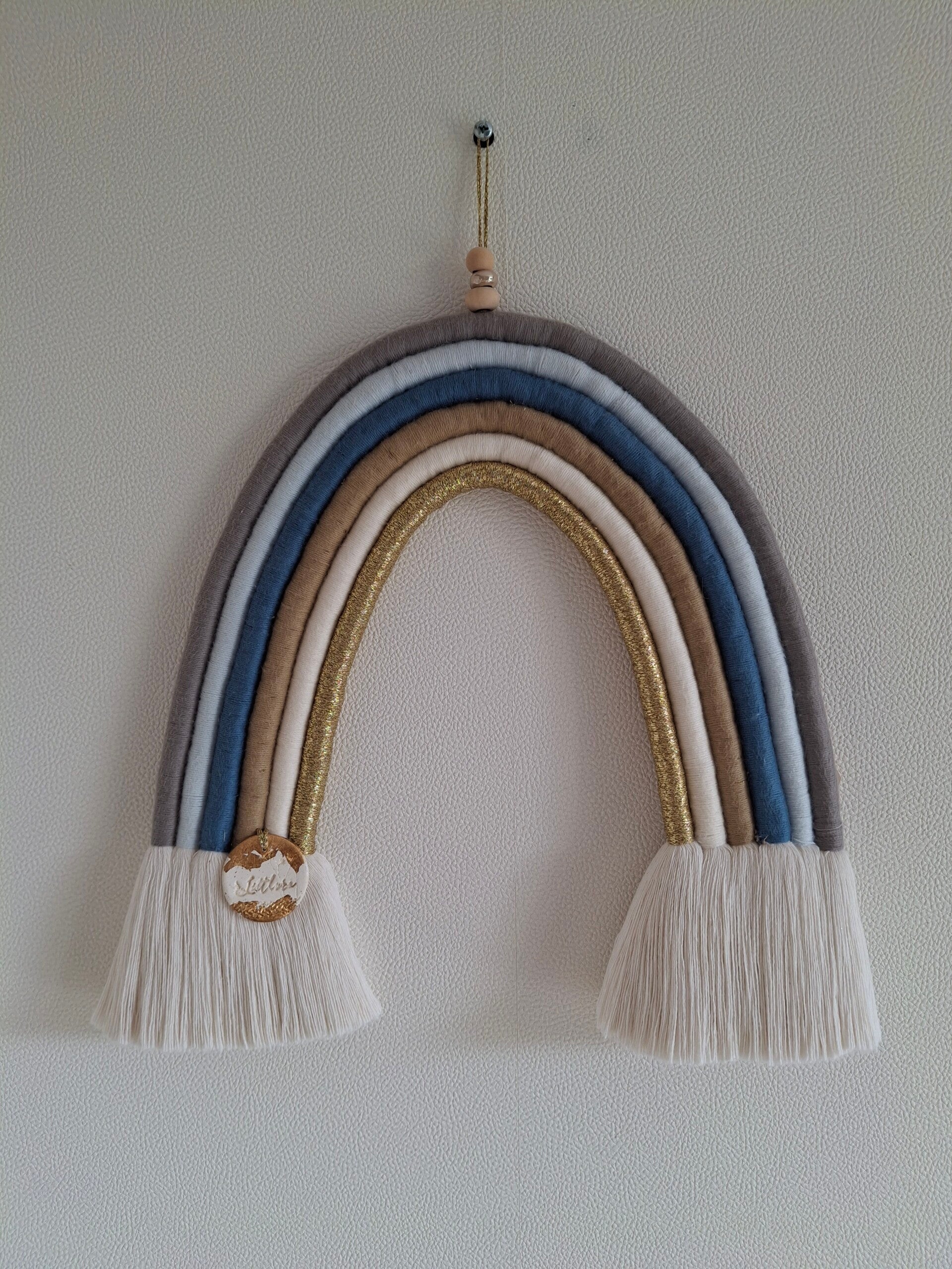 Arc-en-ciel en macramé – Grand modèle bleu, gris & doré