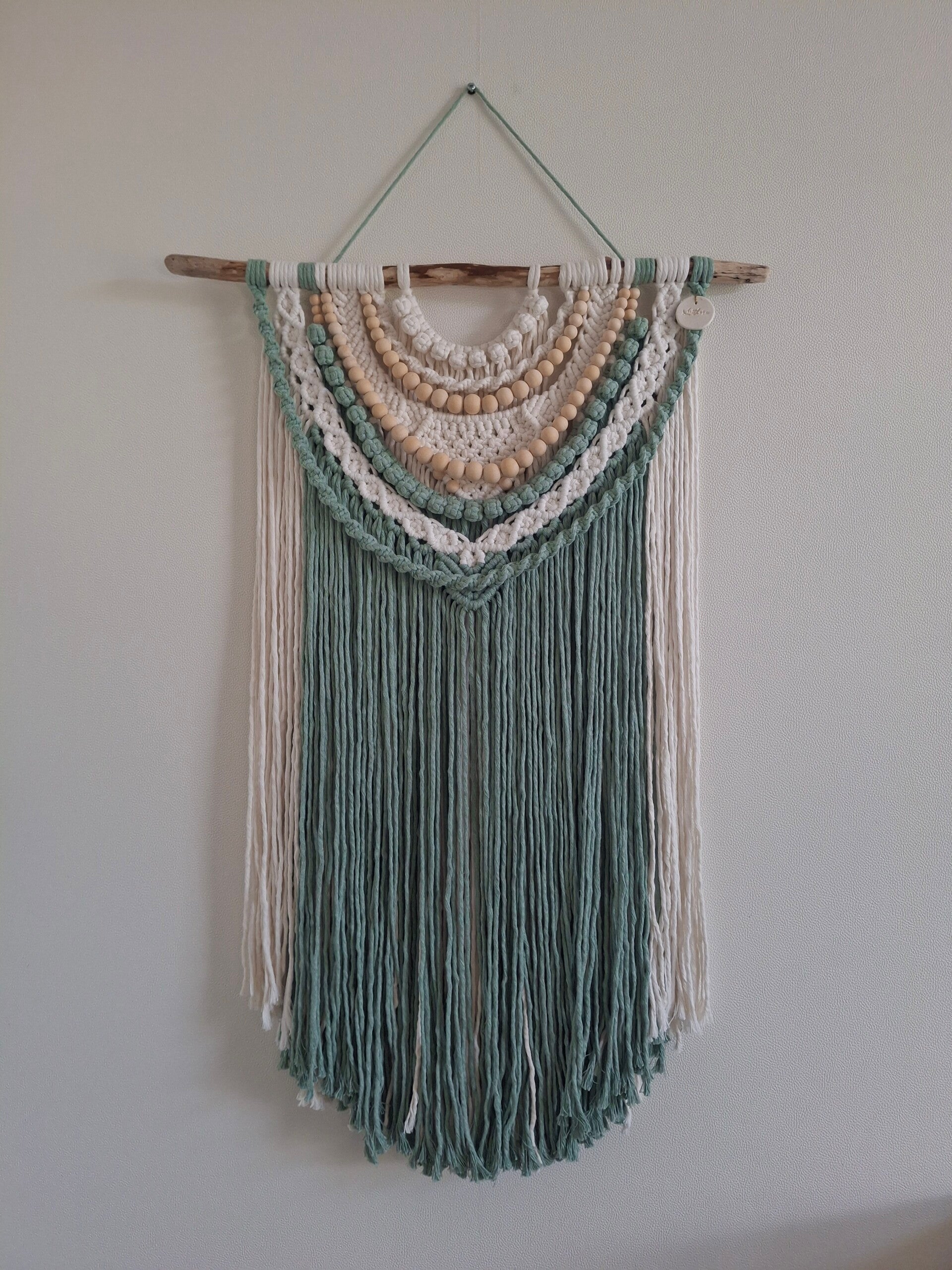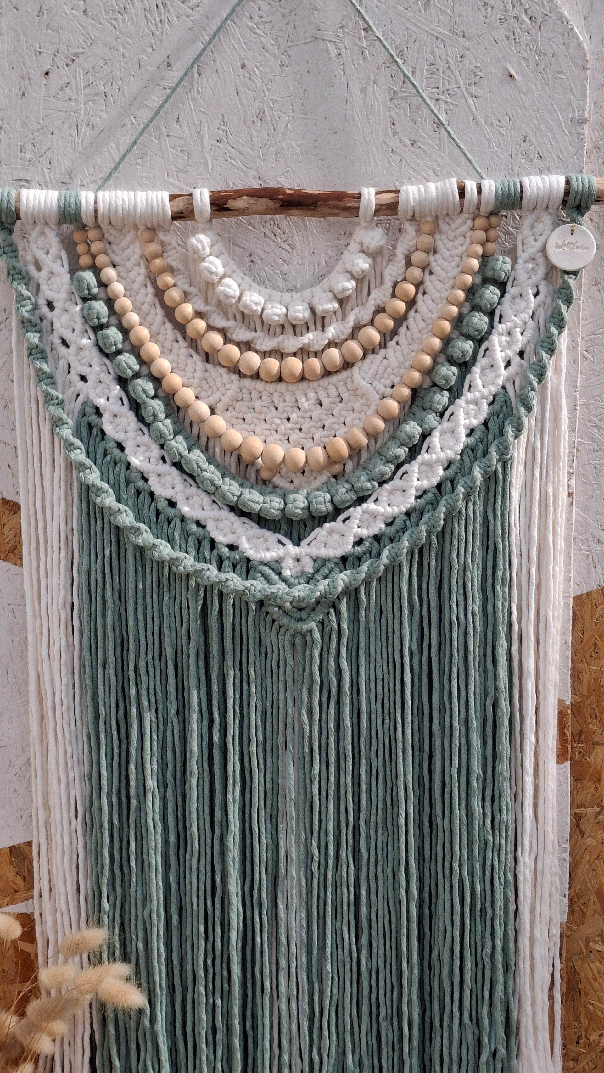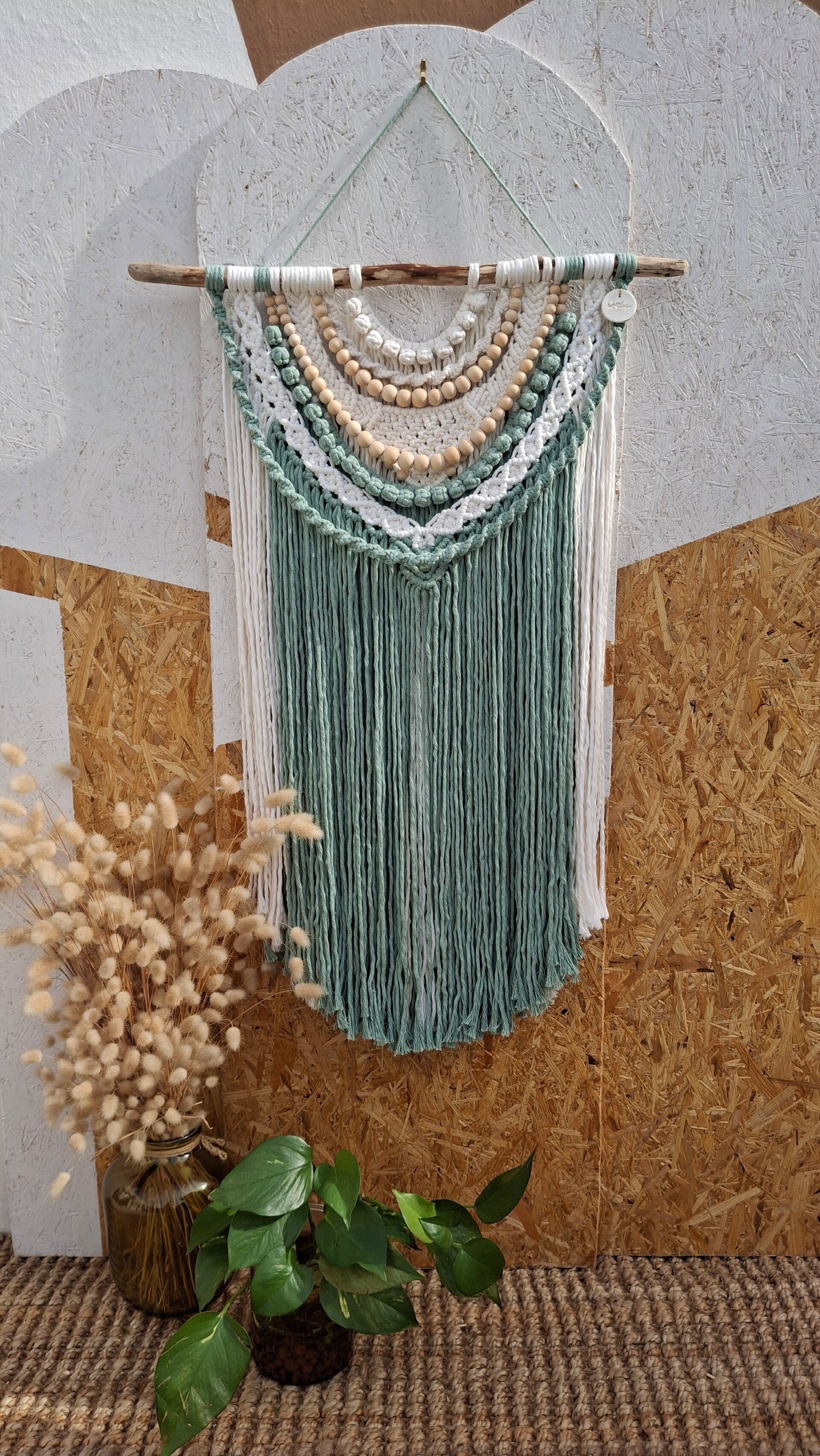 Apportez une touche bohème chic à votre intérieur avec cette tenture murale en macramé fait main. Réalisée en cordes de coton écrues et vert eucalyptus, elle est sublimée par des perles de bois et suspendue à un bois flotté naturel.