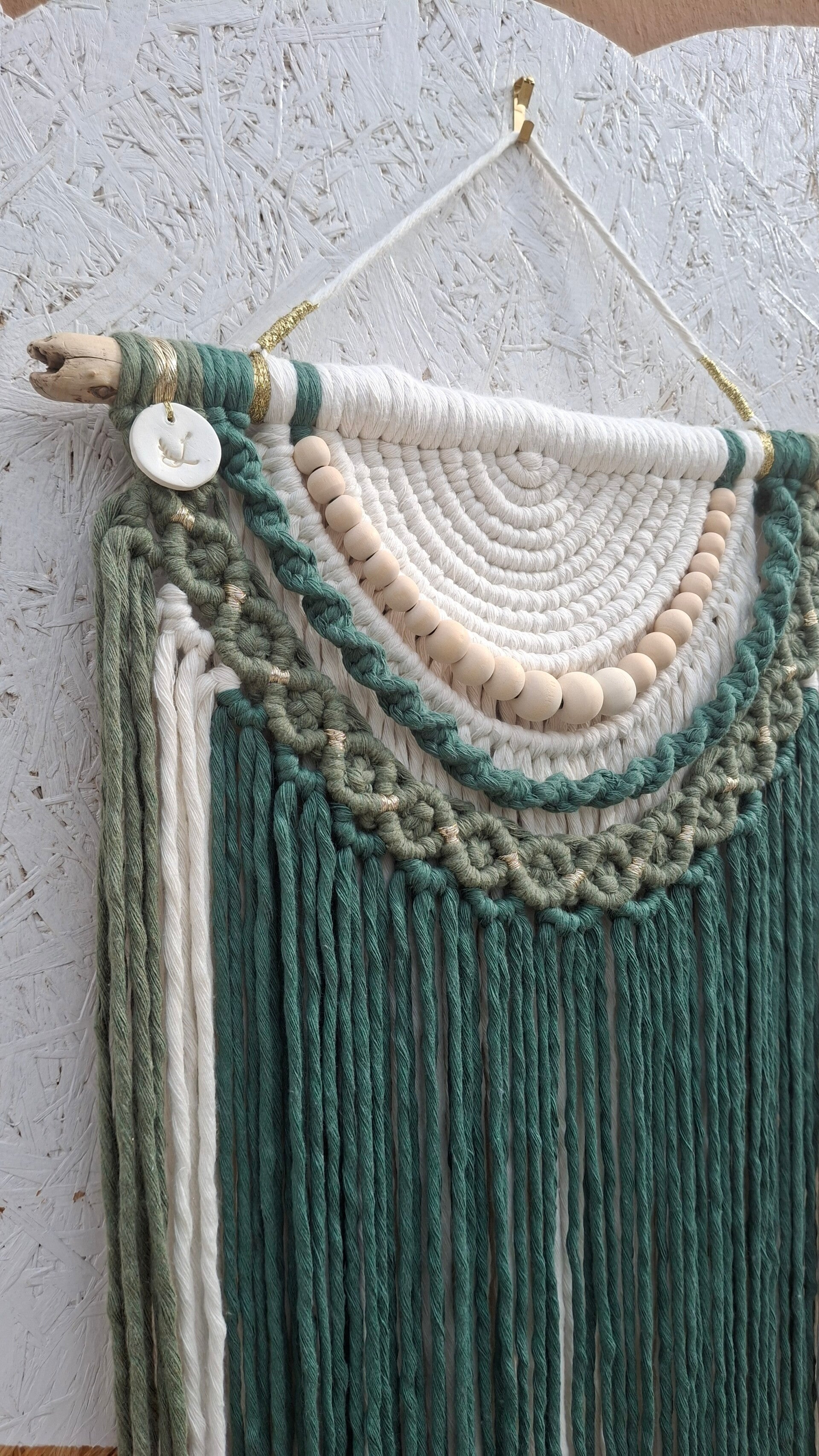 Sous bois_ Grande tenture murale en macramé – Écru, vert & kaki sur bois naturel